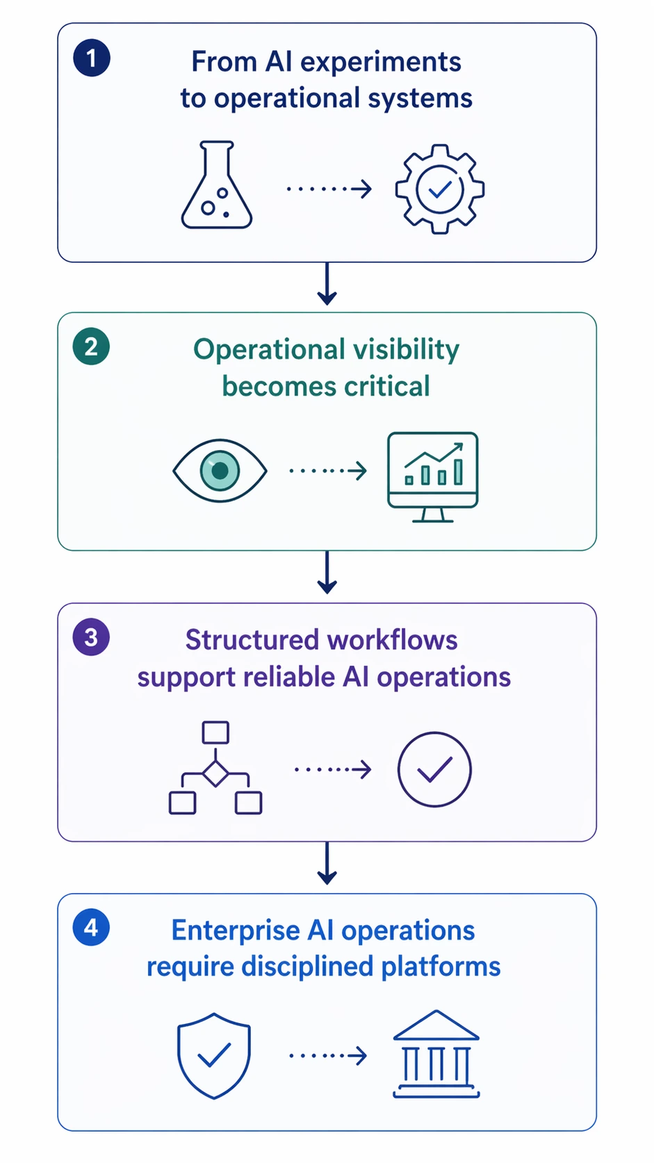 Running AI systems in enterprise environments requires more than experimentation. It requires operational discipline, visibility, and structured execution. Many organizations successfully prototype AI systems but face new challenges when these systems begin operating within real business processes.